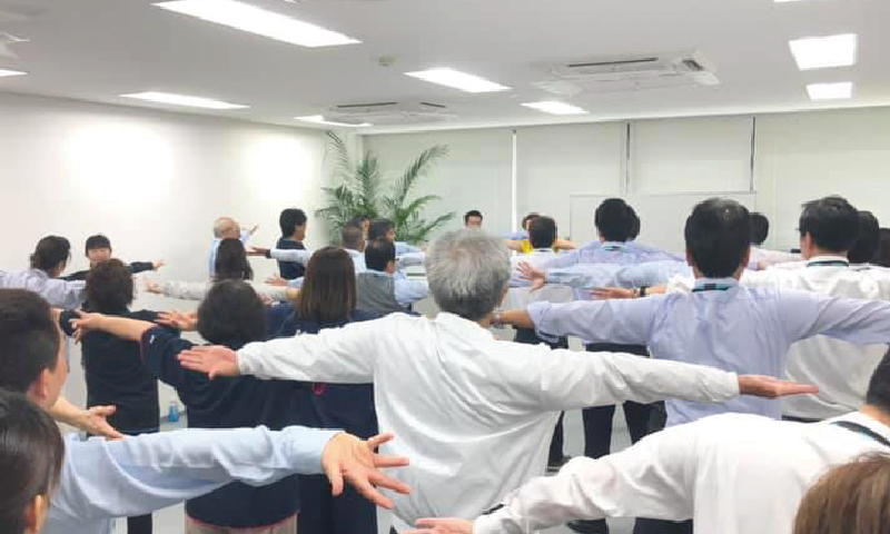 座りながらできるエクササイズを導入。東京本社と北九州支社で開催。